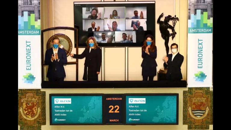 Alfen N.V. celebrates its inclusion in the AMX-index. To mark this company milestone, Roxana van der Hoogt, IT Director of Alfen N.V., sounded the gong this morning. She was welcomed by Alexander Voorham, Listing Account manager for Euronext Amsterdam. The AMX-index (Amsterdam Midcap Index) is part of the AEX Family and contains the largest companies; the following 25 are included in the Midcap.