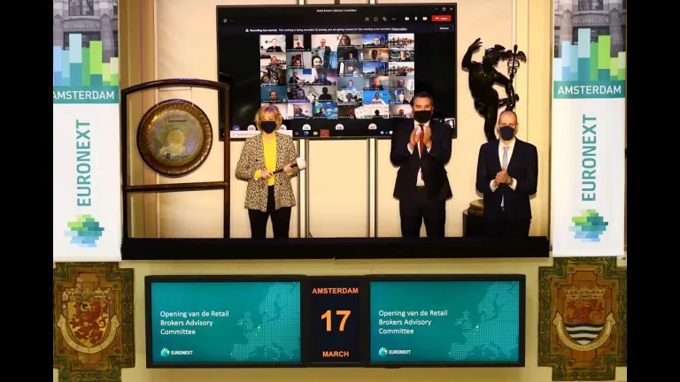 Simone Huis in ‘t Veld, CEO of Euronext Amsterdam, sounded the gong for the opening of the Retail Brokers Advisory Committee. She did this together with Rauke Wouda, Senior Product Developer of Euronext Amsterdam, Robin van Rijn, Client Relationship Manager of Euronext Amsterdam and in the virtual presence of a few committee members.